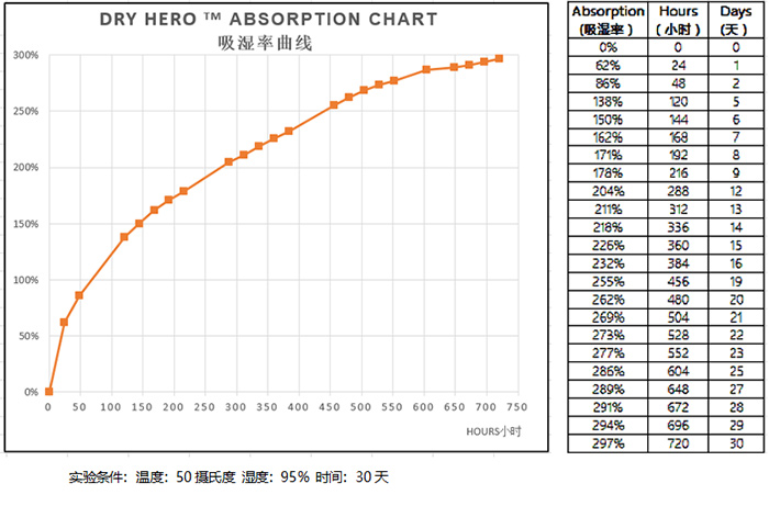 Dry Hero干燥劑吸濕能力可達到自身重量300%,吸潮能力是普通干燥劑的3-4倍。