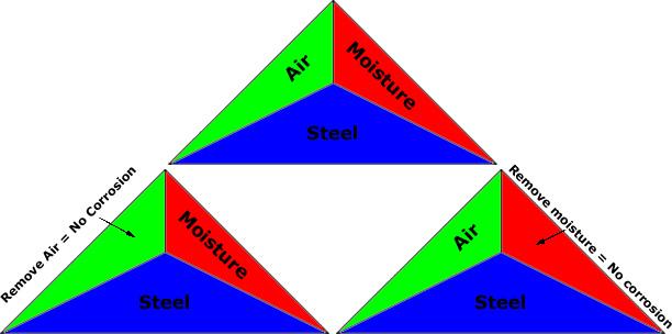 為了避免生銹,可采用多種多樣的防護措施,使金屬表面與環境隔離開來,以保護金屬不受環境中的腐蝕介質的影響,從而防止金屬銹蝕。如下圖所示,隔離去除空氣,控制水汽(濕度)都會有效的進行防銹